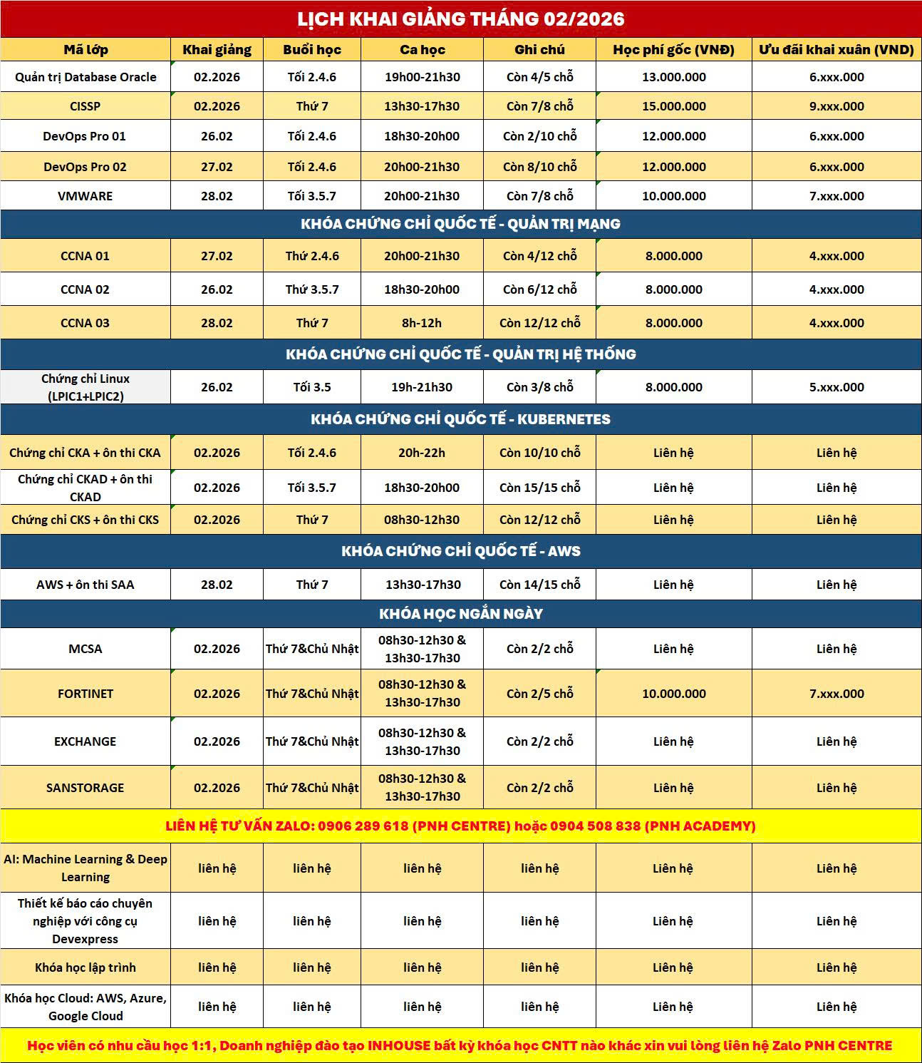 LỊCH KHAI GIẢNG DỰ KIẾN